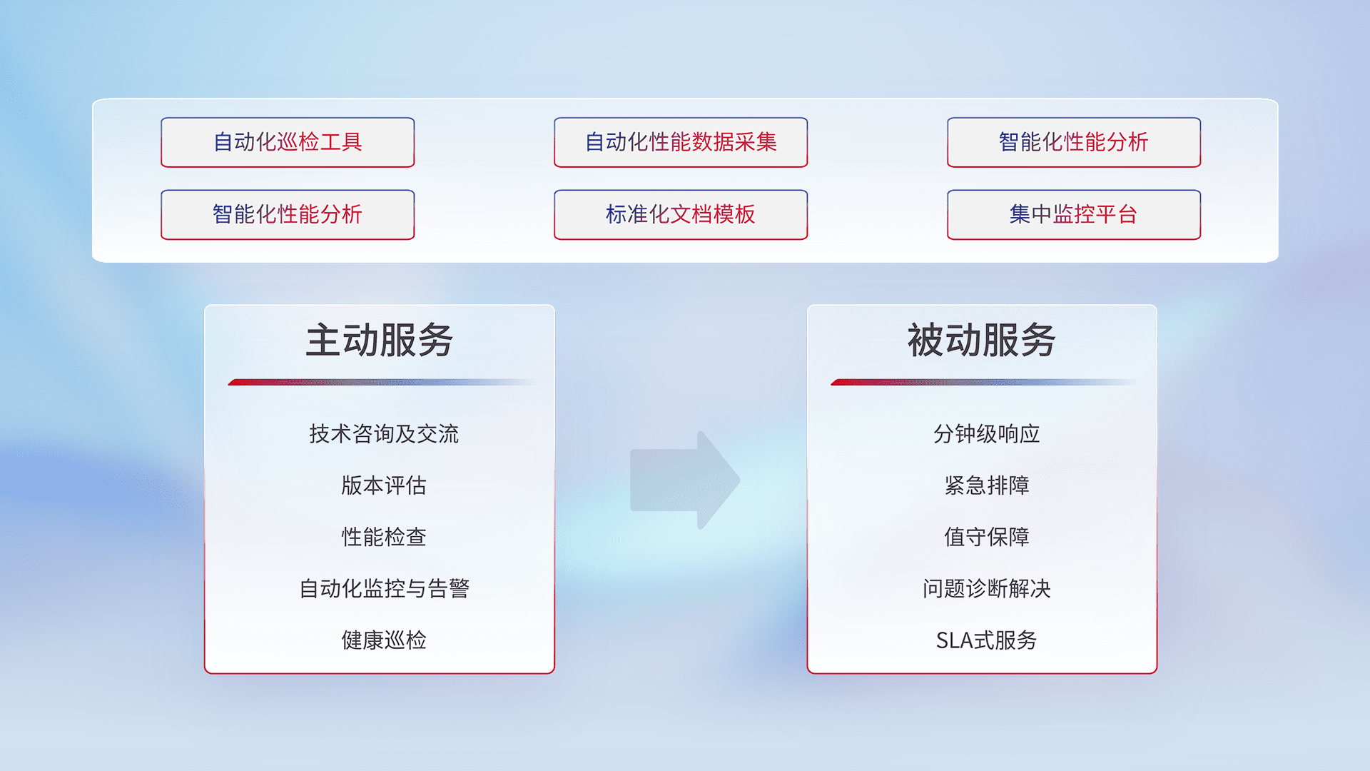 智能化工具和标准化文档,,,保障服务质量,,,,提供主动服务(包含技术咨询、、、、版本评估、、、性能检查、、自动化监控与告警、、、、健康巡检)和被动服务包含(分钟级响应、、、紧急排障、、、值守保障、、、问题诊断解决、、、SLA服务)。。