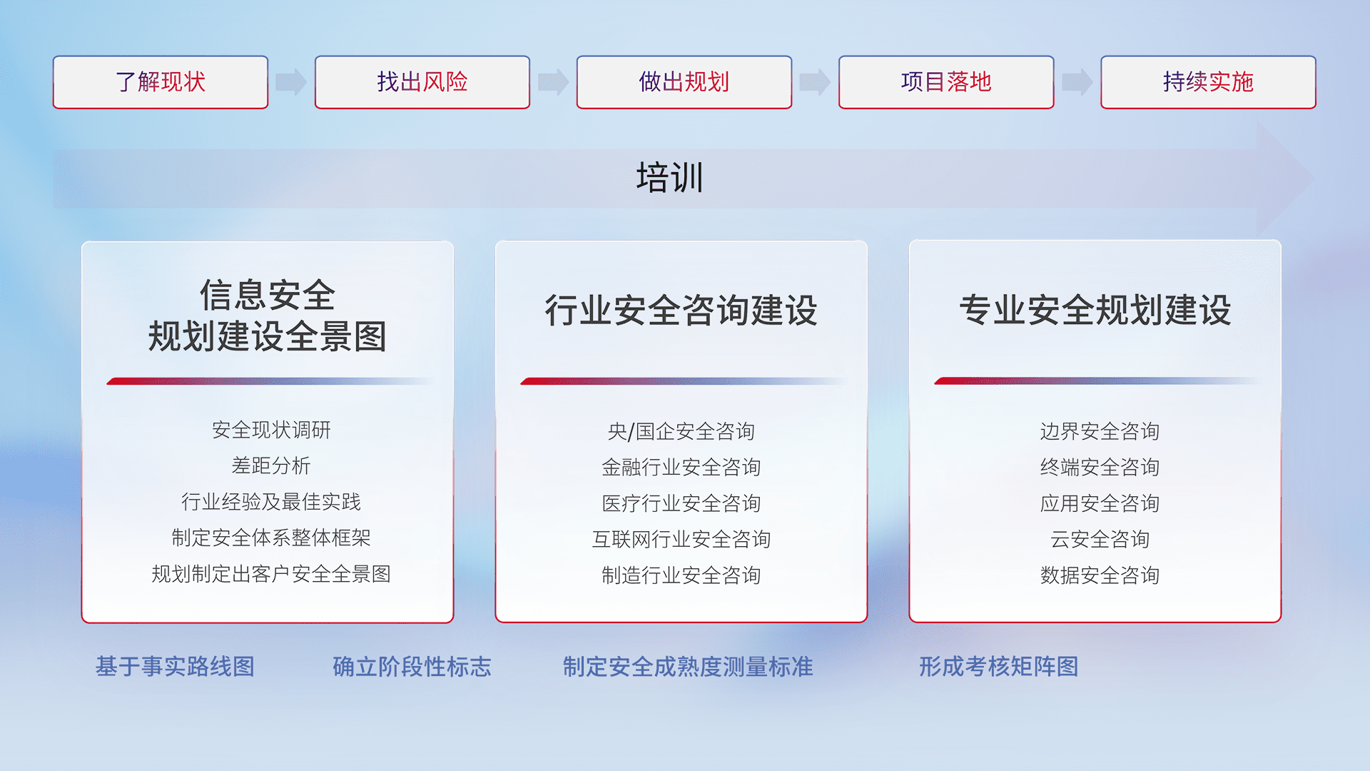 针对客户行业特性,,,以专业的安全服务+多厂商联合解决方案提供专属的一站式安全管理服务,,,帮助客户全面感知网络空间威胁,,基于识别、、检测、、、、分析、、、防护、、监测、、、、响应的服务理论模型,,从方案咨询、、、、集成交付、、评估验证、、、优化加固、、运维运营,,致力于为客户提供完整的闭环管理式安全服务。。。以实战经验为客户打造高抵御风险的安全体系,,帮助客户发现威胁、、、、对抗威胁、、、、处置威胁,,,不断积累安全对抗能力,,持续保障数字化安全。。。。
